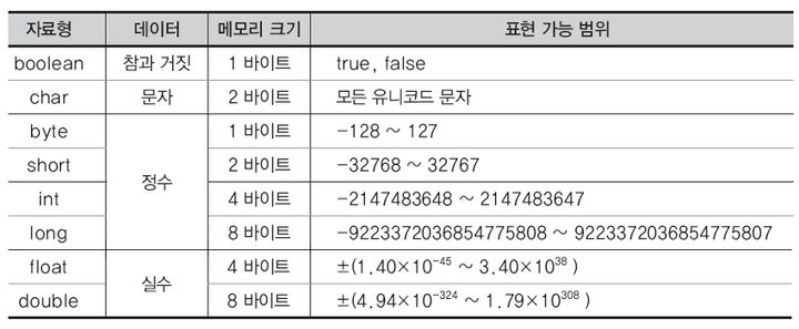 논리형(boolean), 문자형(char), 정수형(byte, short, int, long), 실수형(float, double)